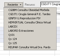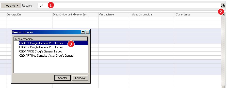 Introduciremos las primeras siglas del servicio en el campo de “Recurso”, pulsaremos sobre el botón de búsqueda (Prismáticos) y seleccionaremos el recurso que queremos.