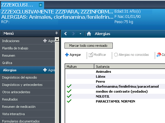 Queremos acceder a las alergias de un paciente. La documentación de las alergias es fundamental para mantener la seguridad del paciente. La introducción correcta de los fármacos a los que pueda tener alergia el paciente, permite la detección por el sistema y la aparición de alertas ante una posible prescripción de los mismos.