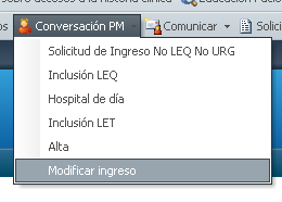 Desde Powerchart o Firstnet, seleccionamos la opción de “Modificar Ingreso” que se encuentra en el botón de “Conversación PM”.